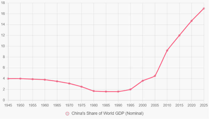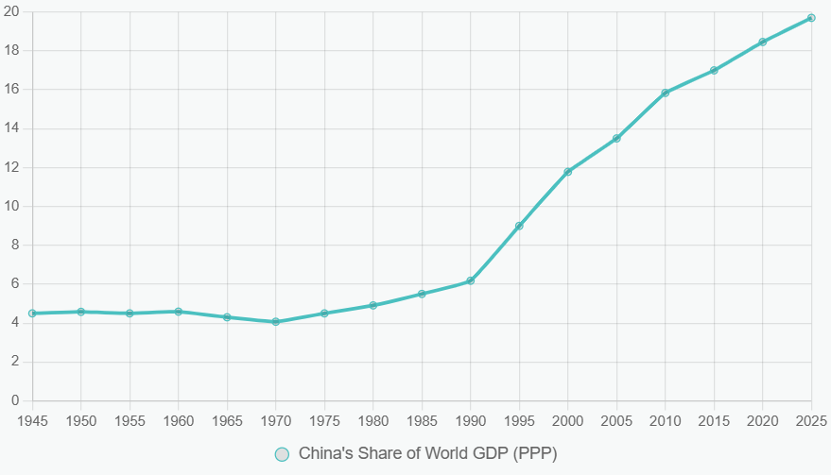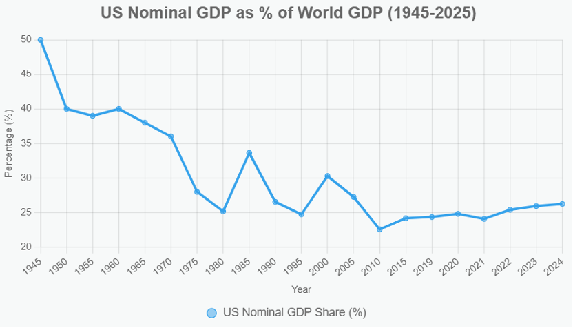 Ποια η ερμηνεία του νέου δόγματος Μονρόε; Δεν χρειάζεται να αυθαιρετήσουμε στην απάντηση αφού αυτή δίνεται με καθαρότητα στο ίδιο το κείμενο του Λευκού Οίκου. Να προσθέσουμε μόνο πως η ερμηνεία του βρίσκεται τόσο στη φύση του αμερικάνικου ιμπεριαλισμού όσο και στην παρούσα συγκυρία η οποία αποτυπώνεται από την εξέλιξη του ΑΕΠ των ΗΠΑ ως ποσοστό του παγκόσμιου ΑΕΠ. Στα παρακάτω δύο διαγράμματα που αφορούν το ποσοστό του ονομαστικού ΑΕΠ των ΗΠΑ ως ποσοστό του παγκόσμιου ΑΕΠ και το ποσοστό του ΑΕΠ των ΗΠΑ με όρους αγοραστικής δύναμης ως ποσοστό του αντίστοιχου παγκόσμιου ΑΕΠ, αποδεικνύεται η δύσκολη κατάσταση στην οποία έχει περιέλθει η μεγάλη ιμπεριαλιστική δύναμη. Αν, μάλιστα, κάνουμε τη σύγκριση με τα αντίστοιχα διαγράμματα που αφορούν την Κίνα κατανοούμε όχι μόνο τη δυσκολία στην οποία έχει περιέλθει ο αμερικανικός ιμπεριαλισμός αλλά και το γεγονός ότι οι τάσεις φαίνονται να είναι μη αντιστρέψιμες. Τα παρακάτω διαγράμματα είναι κάτι περισσότερο από ενδεικτικά[3].