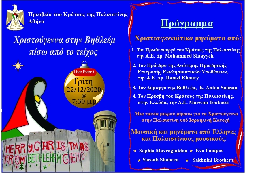 Τα Χριστούγεννα στη Βηθλεέμ πίσω από το τείχος, η ψηφιακή διαδικτυακή εκδήλωση που επιλέξαμε να μοιραστούμε μαζί σας, είναι μια ευκαιρία να στείλουμε τις χριστουγεννιάτικες ευχές και το μήνυμα από την Παλαιστίνη στους φίλους μας στην Ελλάδα με τους οποίους εμείς και ο κόσμος γιορτάζουμε αυτό το γεγονός υπό το φως των περίπλοκων πολιτικών, οικονομικών και υγειονομικών  παγκόσμιων συνθηκών λόγω της εξάπλωσης της επιδημίας Covid 19, ελπίζοντας ότι η ανθρωπότητα θα ενωθεί ενάντια σε αυτές τις προκλήσεις, ώστε το επόμενο έτος 2021 να είναι πιο όμορφο, πιο σταθερό και πιο φωτεινό με  ελευθερία, ισότητα, ειρήνη και ασφάλεια για όλη την ανθρωπότητα.