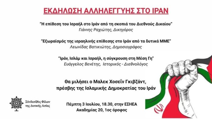 Ο Σύνδεσμος Φίλων την Δυτικής Ασίας σας προσκαλεί στην εκδήλωση αλληλεγγύης στο Ιράν στον απόηχο της πρόσφατης αμερικανοσιωνιστικής επίθεσης, την Πέμπτη 3 Ιουλίου στις 18.30 στην ΕΣΗΕΑ (Αίθουσα “Γεώργιος Καράντζας” 1ος Όροφος).