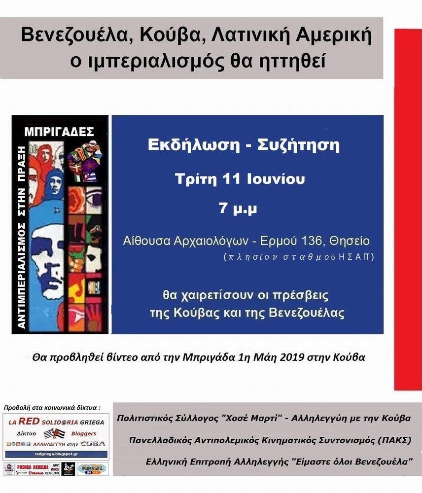 Εκδήλωση με θέμα «Βενεζουέλα, Κούβα, Λατινική Αμερική – ο ιμπεριαλισμός θα ηττηθεί» διοργανώνεται την Τρίτη 11 Ιουνίου, στις 7:00 μ.μ., στον Κήπο του Συλλόγου Ελλήνων Αρχαιολόγων (Ερμού 136, πεζόδρομος Θησείου, δίπλα στο σταθμό ΗΣΑΠ).