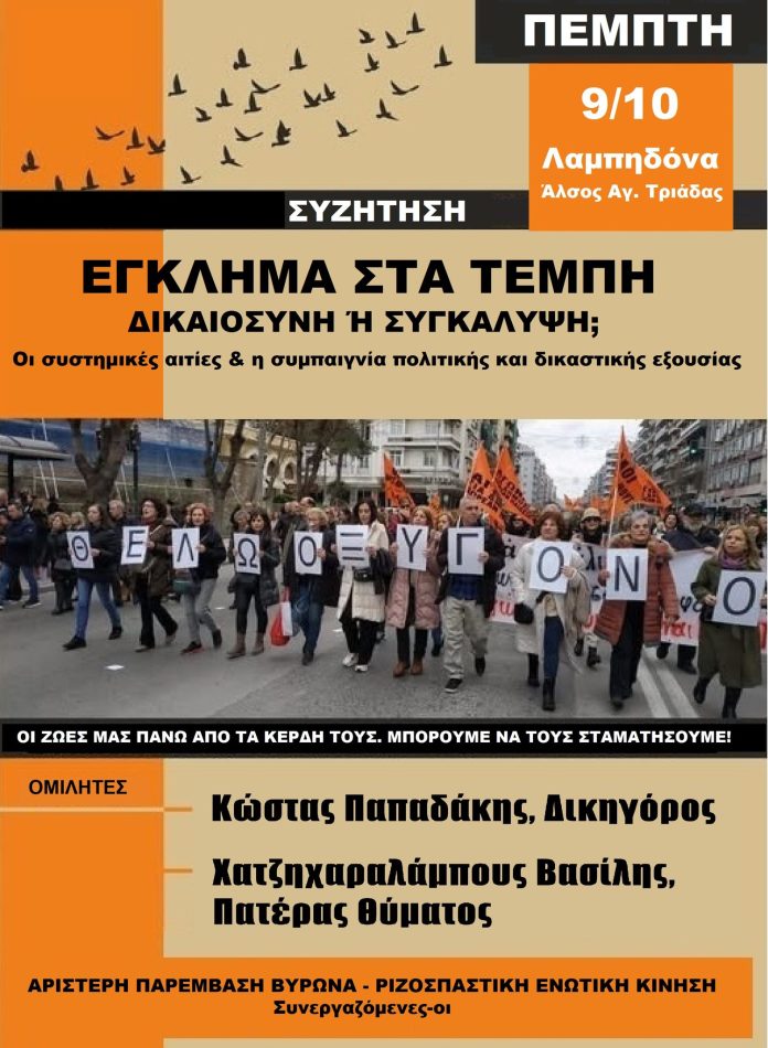 Την Πέμπτη 9. Οκτωβρίου, στις 7:30 μ.μ. η δημοτική πρωτοβουλία ΑΡΠΑ – ΡΕΚ – Συνεργαζόμενες/οι διοργανώνει δημόσια συζήτηση στον φιλόξενο στο φιλόξενο χώρο της Λαμπηδόνας στο Άλσος Αγ. Τριάδας στο Βύρωνα με θέμα: “Έγκλημα στα Τέμπη. Δικαιοσύνη ή συγκάλυψη;” Συζητάμε για τις συστημικές αιτίες που βρίσκονται πίσω από το έγκλημα στα Τέμπη και για τη συμπαιγνία πολιτικής & δικαστικής εξουσίας με τους: