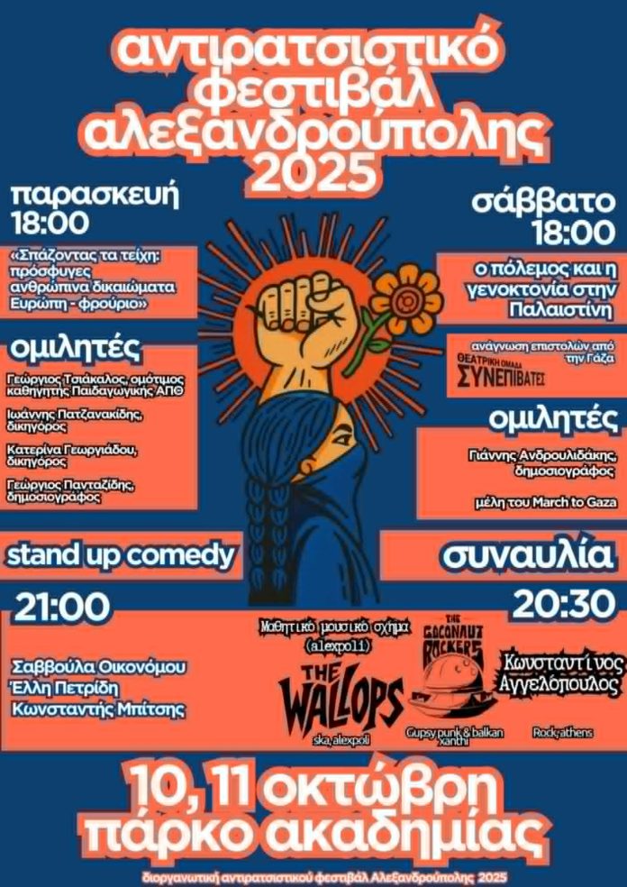 Σάββατο 11 Οκτώβρη 18:00 – Εκδήλωση: «Ο πόλεμος και η γενοκτονία στην Παλαιστίνη» • Ανάγνωση επιστολών από παιδιά στη Γάζα (Θεατρική Ομάδα Συνεπιβάτες) • Ομιλητές: Γιάννης Ανδρουλιδάκης (Δημοσιογράφος), μέλη του March to Gaza 20:30 – Συναυλία • Μαθητικό μουσικό σχήμα • The Coconaut Rockers (Gypsy punk & Balkan – Ξάνθη) • The Wallops (Ska – Αλεξανδρούπολη) • Αγγελόπουλος (Tsopana Rave, Rock – Αθήνα)
