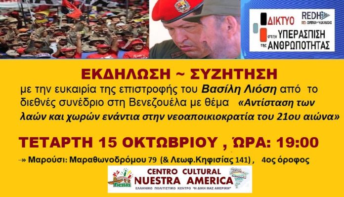 Το Δίκτυο (Διανοουμένων, Καλλιτεχνών & Κοινωνικών Κινημάτων) στην Υπεράσπιση της Ανθρωπότητας – Ελληνικό Τμήμα (REDH GR) καλεί στην Εκδήλωση – Συζήτηση με την ευκαιρία της επιστροφής του Βασίλη Λιόση από το διεθνές συνέδριο στη Βενεζουέλα με θέμα: «Αντίσταση των λαών και χωρών ενάντια στην νεοαποικιοκρατία του 21ου αιώνα».