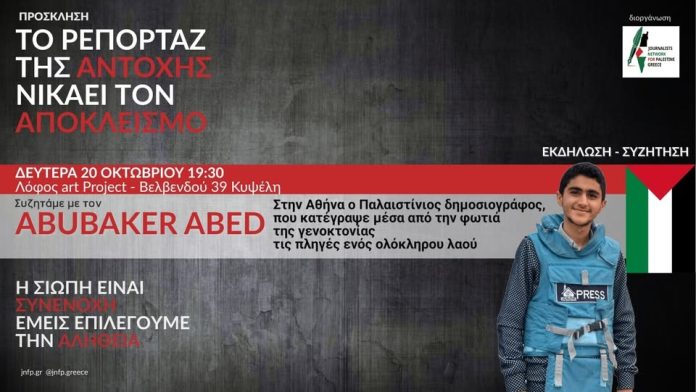 Κατά τη διάρκεια της εκδήλωσης θα παρουσιαστούν και οι πρωτοβουλίες του Journalists Network for Palestine – Greece.
