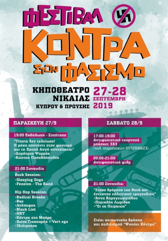 Την Παρασκευή 27 και το Σάββατο 28 Σεπτέμβρη στο Κηποθέατρο της Νίκαιας διοργανώνουμε το πρώτο αντιφασιστικό πολιτικό και πολιτιστικό φεστιβάλ στην πόλη μας, το Φεστιβάλ Κόντρα στο Φασισμό.