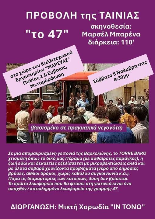 Στο χώρο του καλλιτεχνικού εργαστηρίου ΜΑΡΣΥΑΣ (Πυθίας 2 & Ευβοίας, Μεταμόρφωση) θα προβληθεί το Σαββάτο 8 Νοεμβρίου, στις 8.30, η ταινία «Το 47».