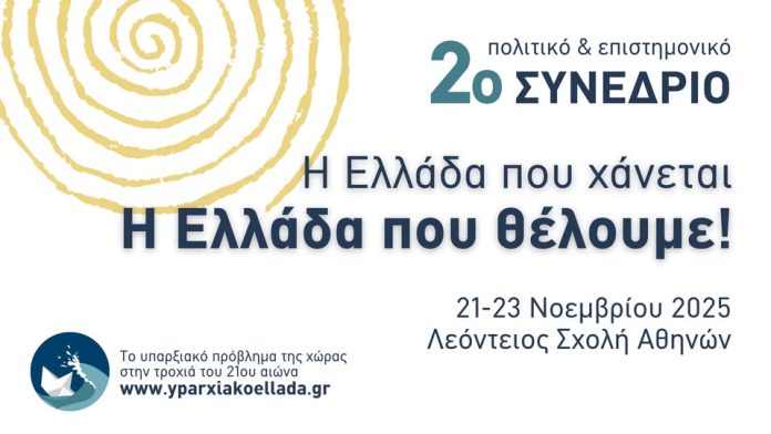 Ξεκινάει την Παρασκευή 21 στις 5:00 το απόγευμα και λήγει την Κυριακή 23 Νοεμβρίου 2025 το δεύτερο συνέδριο για το υπαρξιακό πρόβλημα της Ελλάδας στην τροχιά του 21ου αιώνα. Το συνέδριο θα πραγματοποιηθεί στην Λεόντειο Σχολή Αθηνών (Νεϊγύ 17, Άνω Πατήσια).
