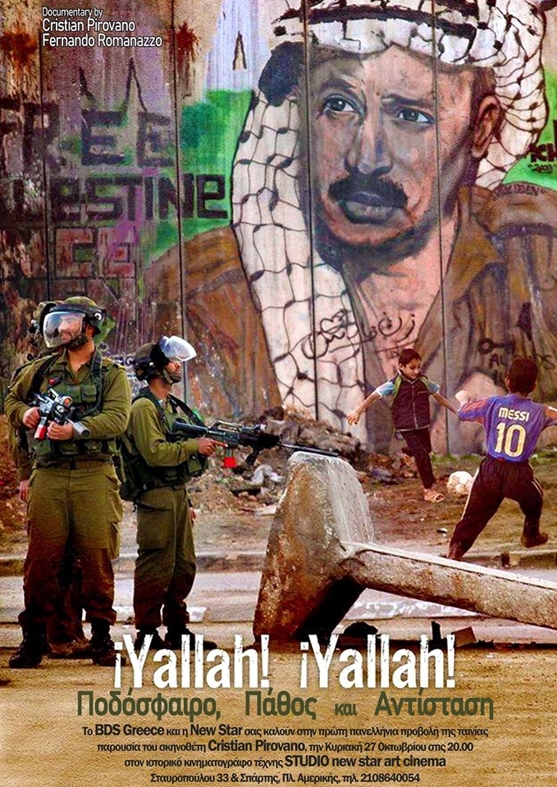 Το BDS Greece σε συνεργασία με την New Star παρουσιάζουν σε πρώτη πανελλήνια προβολή την ταινία για την Παλαιστίνη «!Yallah! !Yallah!: Ποδόσφαιρο, Πάθος και Αντίσταση!» των Αργεντινών σκηνοθετών και παραγωγών Fernando Romanazzo και Cristian Pirovano.