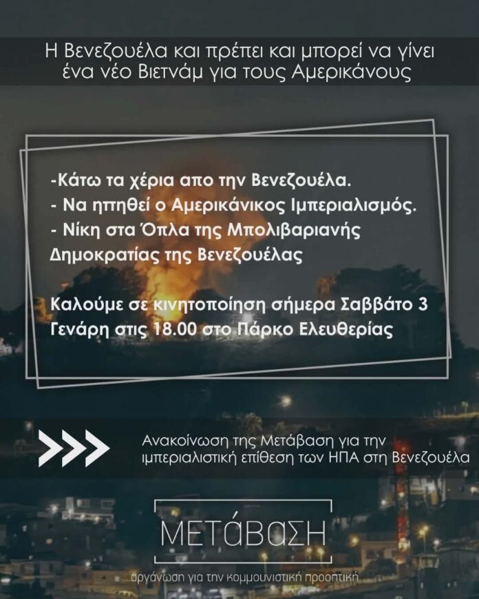 Η απαίτηση για άμεση καταδίκη των παράνομων επιθετικών ενεργειών των ΗΠΑ, η στήριξη της κυβέρνησης και του λάου της Βενεζουέλας πρέπει να αποτελέσουν τον κορμό μιας τέτοιας κίνησης. Απαιτούμε και από την ελληνική κυβέρνηση να πάρει σαφή θέση καταδίκης της παράνομης επέμβασης στο πνεύμα του διεθνούς δικαίου. Να μην υπάρξει καμία σκέψη για στήριξη των ιμπεριαλιστικών αυθαιρεσιών ΗΠΑ και Τραμπ, καμία αναγνώριση καθεστώτος-μαριονέτα των ιμπεριαλιστών!