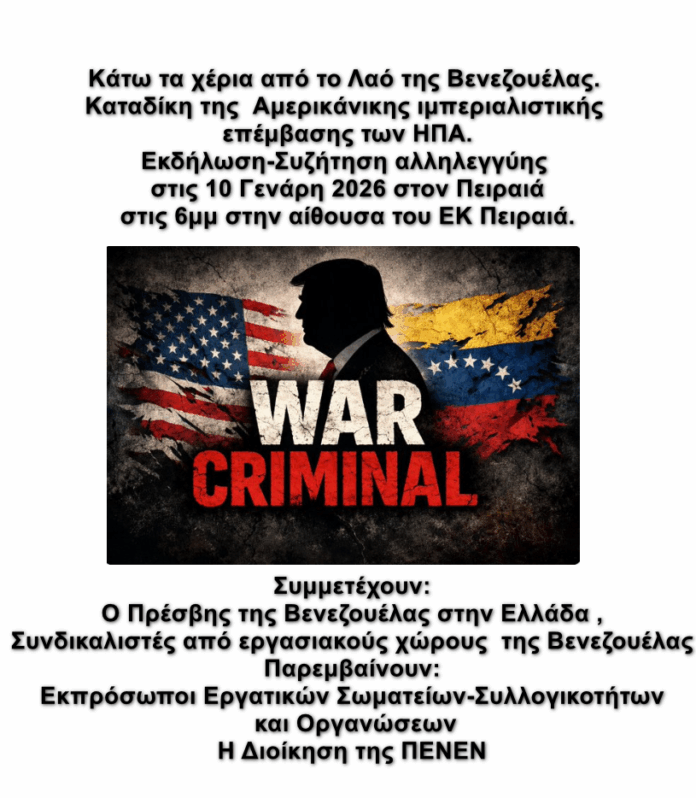 Όλοι και όλες στις 10 Γενάρη 2026 στην Εκδήλωση-Συζήτηση που οργανώνει η ΠΕΝΕΝ εκφράζοντας την αλληλεγγύη όλων μας στον λαό της Βενεζουέλας.