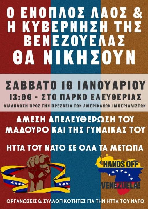Σε ολόκληρο τον πλανήτη και ειδικά στη Λατινική Αμερική, όπως και στη χώρα μας, το Σάββατο αποτέλεσε μέρα διεθνιστικής αλληλεγγύης και καταδίκης της ένοπλης επέμβασης των ΗΠΑ και της απαγωγής του νόμιμα εκλεγμένου προέδρου της Βενεζουέλας και της γυναίκας του.