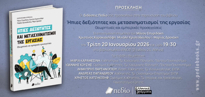 Οι εκδόσεις πεδίο σας προσκαλούν στην παρουσίαση του βιβλίου «Ήπιες δεξιότητες και μετασχηματισμοί της εργασίας – θεωρητικές και εμπειρικές προσεγγίσεις» σε επιστημονική επιμέλεια των Μάνου Σπυριδάκη, Χριστίνας Καρακιουλάφη, Μιχάλη Χριστοδούλου και Μαρίας Δρακάκη, την Τρίτη 20 Ιανουαρίου 2026 και ώρα 7:30 στο βιβλιοπωλείο Ιανός (Σταδίου 24).