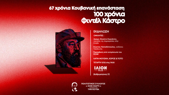 Η ετήσια εκδήλωση του Πολιτιστικού Συλλόγου «Χοσέ Μαρτί» – Αλληλεγγύη με την Κούβα, είναι φέτος αφιερωμένη στην 67η επέτειο της Κουβανικής Επανάστασης και ταυτόχρονα στα 100 χρόνια από τη γέννηση του Φιντέλ Κάστρο, με αφορμή την ανακήρυξη του 2026 ως Έτους Φιντέλ.