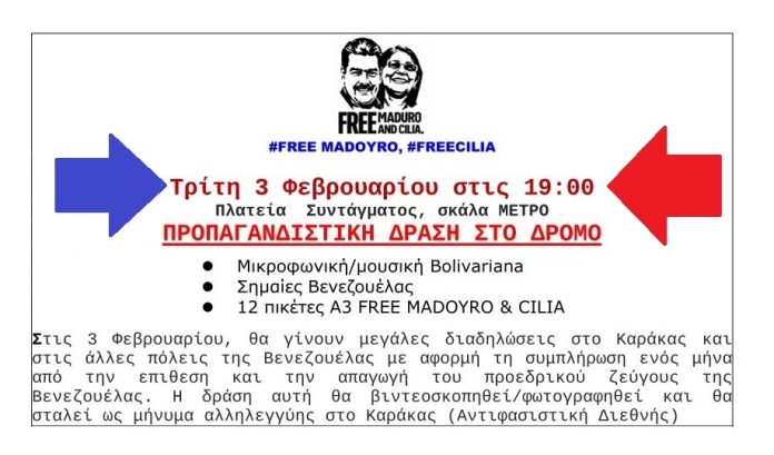 Στις 3 Φεβρουαρίου, θα γίνουν mεγάλες διαδηλώσεις στο Καράκας και στις άλλες πόλεις της Βενεζουέλας με αφορμή τη συμπλήρωση ενός μήνα από την επιθεση και την απαγωγή του προεδρικού ζεύγους της Βενεζουέλας. Η δράση αυτή θα βιντεοσκοπηθεί/φωτογραφηθεί και θα σταλεί ως μήνυμα αλληλεγγύης στο Καράκας (Αντιφασιστική Διεθνής).