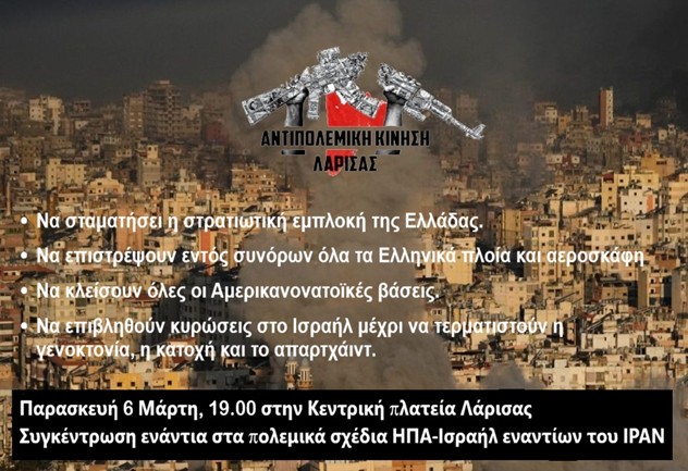 Η Αντιπολεμική Κίνηση Λάρισας καταγγέλλει την παράνομη και άκρως επικίνδυνη επίθεση των φονιάδων των λαών ΗΠΑ – Ισραήλ στο Ιράν και καλεί τον λαό της Λάρισας στην συγκέντρωση την Παρασκευή 6 Μάρτη στις 19.00 στην κεντρική πλατεία, ενάντια στα πολεμικά τους σχέδια που εμπλέκουν και την χώρα μας.