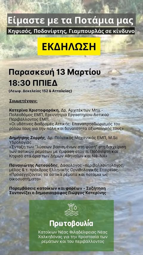 Η Πρωτοβουλία Πολιτών Ν. Φιλαδέλφειας – Ν. Χαλκηδόνας διοργανώνει ενημερωτική εκδήλωση με θέμα: «Είμαστε με τα ποτάμια μας – Κηφισός, Ποδονίφτης, Γιαμπουρλάς σε κίνδυνο»