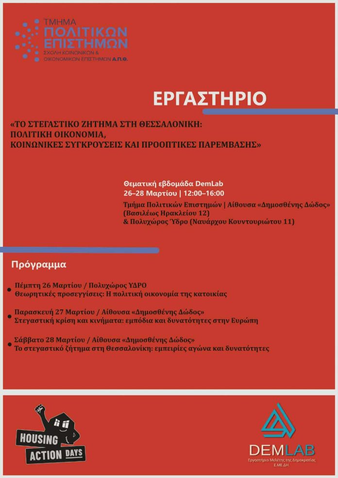 Στο πλαίσιο των Παγκόσμιων Ημερών Δράσης για τη Στέγαση (23–29 Μαρτίου), το Εργαστήριο Μελέτης της Δημοκρατίας (DemLab) του Τμήματος Πολιτικών Επιστημών του ΑΠΘ διοργανώνει τριήμερο εργαστήριο με θέμα το στεγαστικό ζήτημα στη Θεσσαλονίκη, από τις 26 έως τις 28 Μαρτίου.