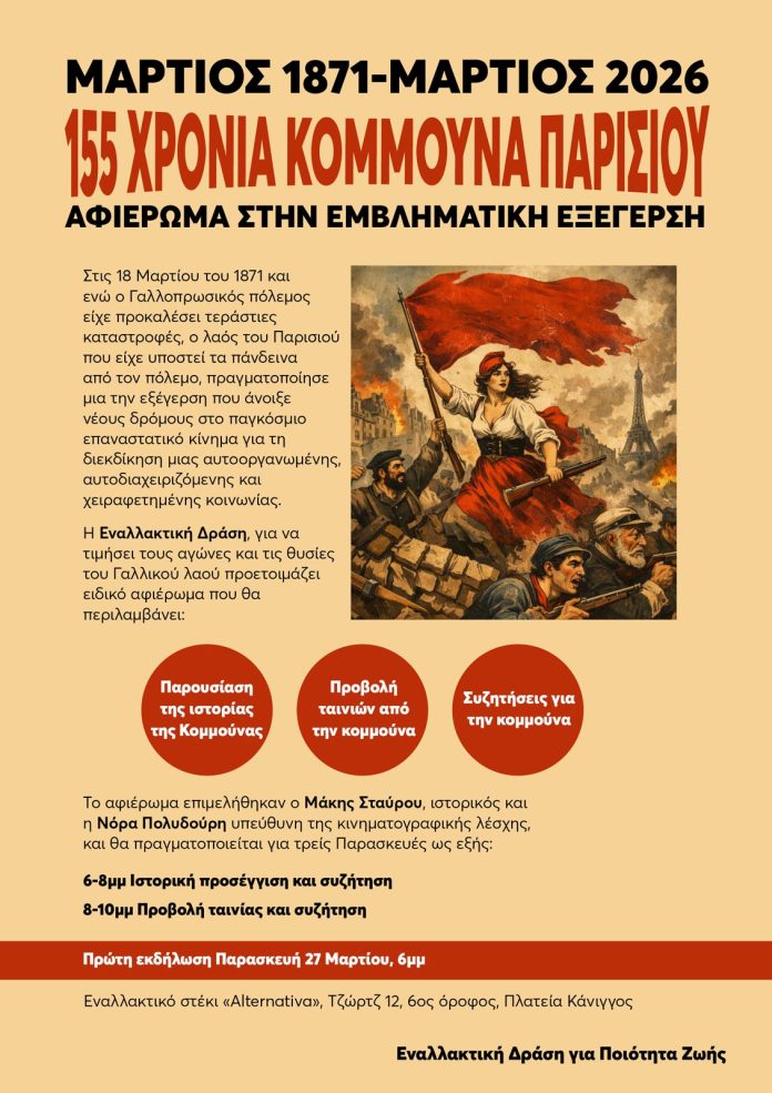 Στις 18 Μαρτίου του 1871 και ενώ ο Γαλλοπρωσικός πόλεμος είχε προκαλέσει τεράστιες καταστροφές, ο λαός του Παρισιού που είχε υποστεί τα πάνδεινα από τον πόλεμο, πραγματοποίησε μια εξέγερση που άνοιξε νέους δρόμους στο παγκόσμιο επαναστατικό κίνημα για τη διεκδίκηση μιας αυτοοργανωμένης, αυτοδιαχειριζόμενης και χειραφετημένης κοινωνίας. Σήμερα που για μια ακόμη φορά, ο πλανήτης βιώνει και πάλι την βάρβαρη επέλαση του ιμπεριαλισμού με χιλιάδες νεκρούς και ανυπολόγιστες καταστροφές τα διδάγματα της Κομμούνας του Παρισιού είναι πολύ χρήσιμα Για το λόγο αυτό Η Εναλλακτική Δράση, θα πραγματοποιήσει ειδικό αφιέρωμα για την εμβληματική αυτή εξέγερση, που θα γίνει σε τρεις Παρασκευές και θα περιλαμβάνει: