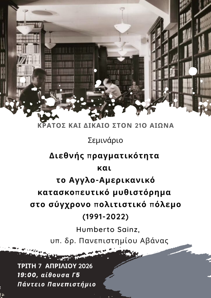 ΑρχικήΑΝΑΚΟΙΝΩΣΕΙΣ - ΕΚΔΗΛΩΣΕΙΣ ΑΝΑΚΟΙΝΩΣΕΙΣ - ΕΚΔΗΛΩΣΕΙΣ Σεμινάριο: Διεθνής πραγματικότητα και το Αγγλο-αμερικανικό κατασκοπευτικό μυθιστόρημα By KOMMON 7 Απριλίου, 2026 Huberto Sainz, υπ. Δρ. Πανεπιστημίου Αβάνας Τρίτη 7 Απριλίου, 19:00, αίθουσα Γ5, Πάντειο Πανεπιστήμιο Κοινοποίηση FacebookX 0ΥποστηρικτέςΚάντε Like ΤΕΛΕΥΤΑΙΑ ΑΡΘΡΑ ΑΠΟ ΣΥΝΤΑΚΤΗ ΠΟΛΙΤΙΣΜΟΣ Ν. Καζαντζάκη-Αδερφοφάδες και Ασκητική: Ρομαντικός υπαρξισμός και υπερβατικό αδιέξοδo, του Παύλου Μουρουζίδη ΔΙΕΘΝΗ Ουγγαρία: Ένας Ορμπάν χωρίς τον ΟΠΕΚΕΠΕ, του Άρη Χατζηστεφάνου ΠΟΛΙΤΙΚΗ Σιωνιστική τρομοκρατία στο κέντρο της Αθήνας ΠΡΟΣΦΑΤΑ ΑΡΘΡΑ ΠΑΡΕΜΒΑΣΕΙΣ Μέση Ανατολή: Τα διδακτικά παθήματα όσων «προσκολλήθηκαν» στις ΗΠΑ, του Διονύση Ελευθεράτου ΑΝΑΚΟΙΝΩΣΕΙΣ - ΕΚΔΗΛΩΣΕΙΣ Έξω οι σιωνιστές από την Αθήνα ΔΙΕΘΝΗ Το Πνεύμα της Τεχεράνης ΔΗΜΟΦΙΛΗ ΕΡΓΑΤΙΚΟ ΚΙΝΗΜΑ Βόμβα Στουρνάρα για την φορολογία των ναυτεργατών ΠΑΡΕΜΒΑΣΕΙΣ Η έκθεση της εισηγήτριας του ΟΗΕ Φραντζέσκα Αλμπανέζε για τα βασανιστήρια του Ισραήλ στους Παλαιστίνιους, της Αντωνίας Πάνου ΠΟΛΙΤΙΚΗ Υποκλοπές, παραγραφές και μια «ατυχία»: Δεν αναστήθηκε ο Τσακ Νόρις… Η ΕΒΔΟΜΑΔΑ ΤΟΥ ΚΕΡΒΕΡΟΥ Νέες εκδόσεις Ανακοίνωση για το αρχείο του Γρηγόρη Φαράκου ΠΑΡΕΜΒΑΣΕΙΣ 7 Απριλίου – Παγκόσμια Ημέρα Υγείας και η περίπτωση του υφυπουργού Λαζαρίδη, του Στέλιου Μερμίγκη ΔΙΕΘΝΗ Η θέση της Αμερικής πληγώνεται και το Ισραήλ εισέρχεται σε ένα στρατηγικό δίλημμα ΠΑΡΕΜΒΑΣΕΙΣ Οι 10 όροι της εκεχειρίας του Ιράν ταπεινώνουν τις ΗΠΑ, του Λεωνίδα Βατικιώτη ΑΝΑΚΟΙΝΩΣΕΙΣ - ΕΚΔΗΛΩΣΕΙΣ Η Ελλάδα χρηματοδοτεί την ισραηλινή μηχανή γενοκτονίας! ΠΑΡΕΜΒΑΣΕΙΣ ΠΑΣΧΑΛΙΝΟ ΔΙΗΓΗΜΑ Η εκδίκηση των δένδρων, της Όλγας Μοσχοχωρίτου ΠΑΡΕΜΒΑΣΕΙΣ Ο ΟΠΕΚΕΠΕ, η σήψη, έξι «τούμπες» και η ΕΕ, του Διονύση Ελευθεράτου Φόρτωση περισσοτέρων