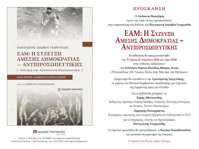 Την Τετάρτη 22 Απριλίου 2026 στις 19:00 θα πραγματοποιηθεί στην αίθουσα εκδηλώσεων του Συλλόγου Νησίου Πισιδίας Μικράς Ασίας παρουσίαση του βιβλίου ΕΑΜ: Η σύζευξη ‘άμεσης δημοκρατίας αντιπροσωπευτικής του Παναγιώτη Ιάκωβου Γεωργούδη (εκδ. Παπαζήση).