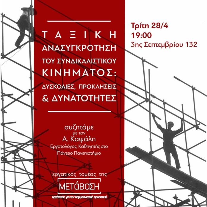 Ο εργατικός τομέας της Μετάβασης διοργανώνει μια δεύτερη συζήτηση για τη σύγχρονη εργατική τάξη με καλεσμένο τον Απόστολο Καψάλη, εργατολόγο και Καθηγητή στο Πάντειο Πανεπιστήμιο. Η συζήτηση θα πραγματοποιηθεί Τρίτη 28 Απρίλη, 19:00 στα γραφεία μας, 3η Σεπτεμβρίου 132.