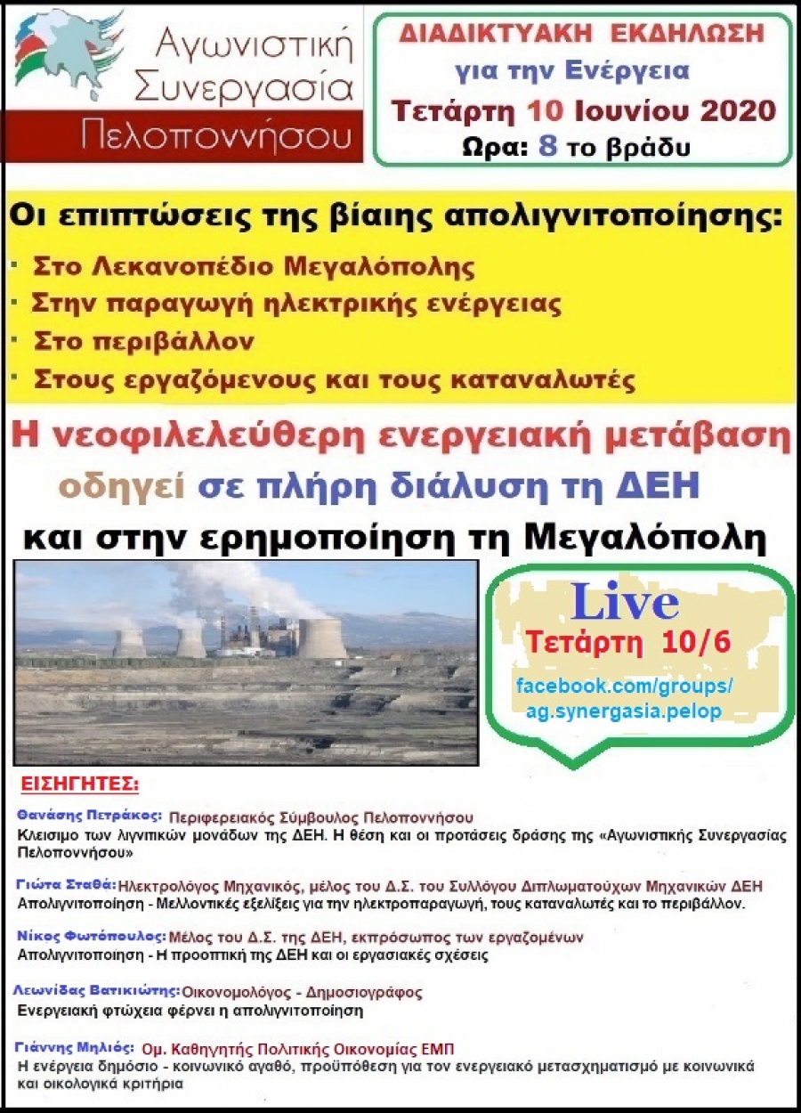 Την Τετάρτη 10 Ιουνίου 2020 στις 8 το βράδυ η «Αγωνιστική Συνεργασία Πελοποννήσου» διοργανώνει ζωντανή διαδικτυακή εκδήλωση – συζήτηση με θέμα: «Οι επιπτώσεις της βίαιης απολιγνιτοποίησης στο Λεκανοπέδιο Μεγαλόπολης, την παραγωγή ηλεκτρικής ενέργειας, το περιβάλλον, τους εργαζομένους και τους καταναλωτές».