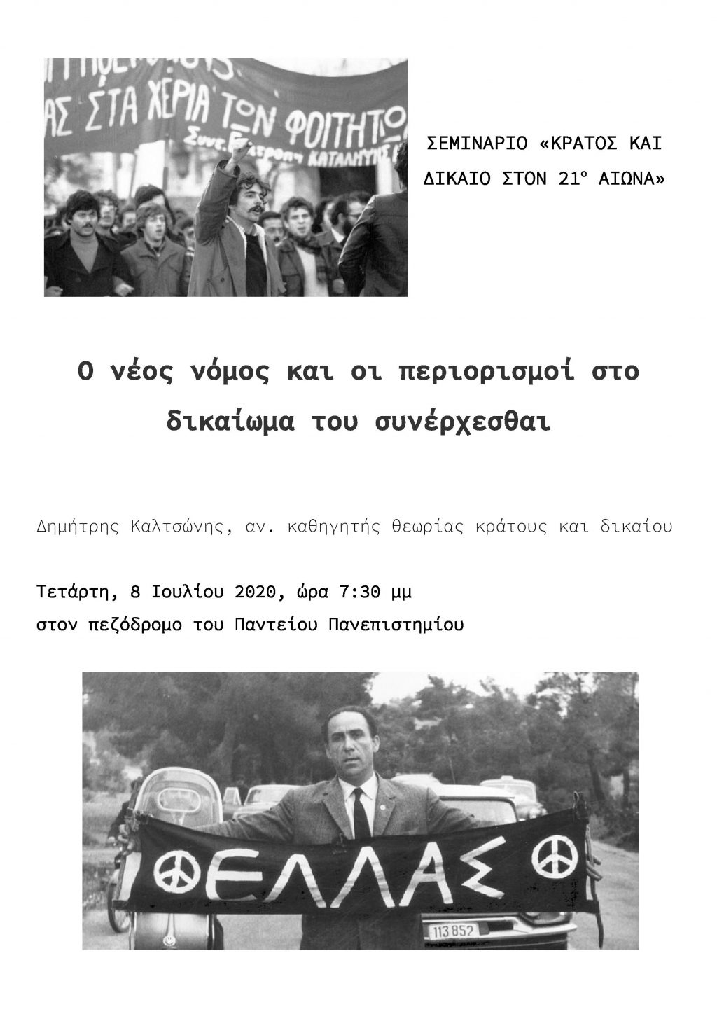 ΑΝΑΚΟΙΝΩΣΕΙΣ - ΕΚΔΗΛΩΣΕΙΣ Σεμινάριο Κράτος και Δίκαιο στον 21ο Αιώνα Από KOMMON - 8 Ιουλίου, 2020 0 186 FacebookX Διάλεξη Δ. Καλτσώνη, 8/7, 19:30, Πεζόδρομος Παντείου: Ο νέος νόμος και οι περιορισμοί στο δικαίωμα του συνέρχεσθαι