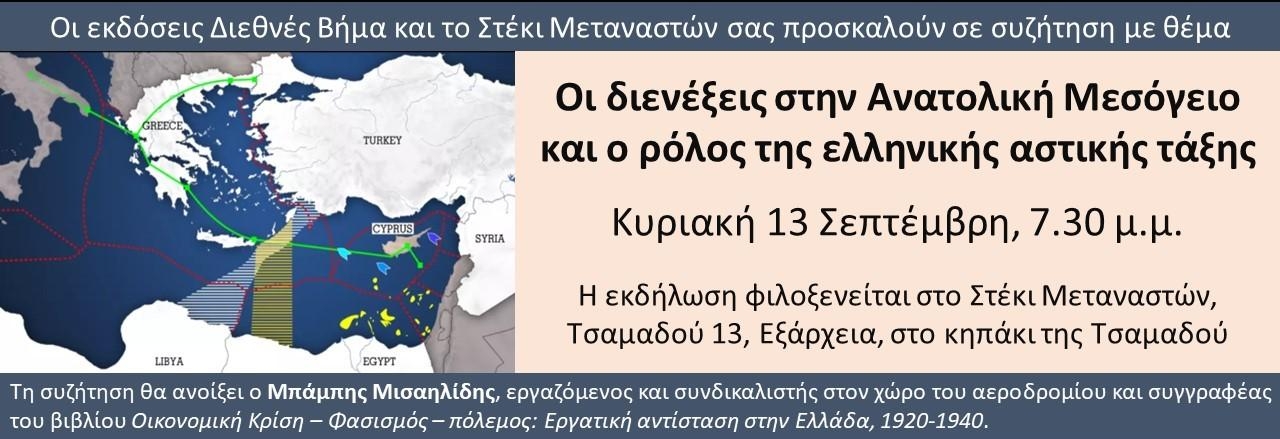 Η ελληνική τάξη των εργοδοτών και η κυβέρνηση που προωθεί τα συμφέροντά της, βρίσκονται σε μια φιλοπόλεμη εκστρατεία που στόχος της είναι η μετατροπή του Αιγαίου σε «ελληνική λίμνη», κατακτώντας μια κυρίαρχη θέση στην Ανατολική Μεσόγειο. Επιδιώκουν να πείσουν τους εργαζόμενους ότι έχουμε κοινά «εθνικά συμφέροντα» με τα αφεντικά μας και ότι τελικά «όλοι» έχουμε να κερδίσουμε από τον αποκλεισμό της τουρκικής αστικής τάξης «με όλα τα αναγκαία μέσα» από την εκμετάλλευση των πλουτοπαραγωγικών πηγών της Ανατολικής Μεσογείου. Οι συμφωνίες για Αποκλειστική Οικονομική Ζώνη με την Ιταλία και την Αίγυπτο αποτελούν σημαντικούς σταθμούς σε αυτή την καμπάνια.