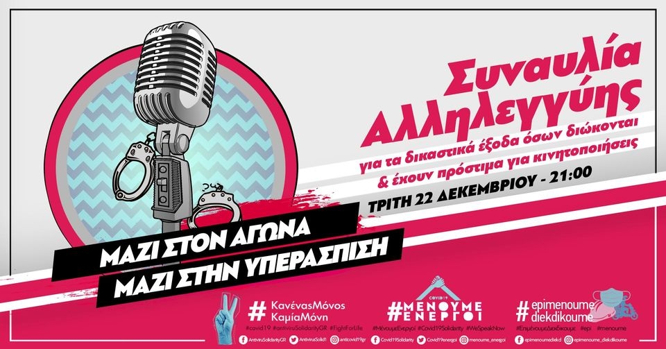 Την Τρίτη 22 Δεκεμβρίου διοργανώνουμε διαδικτυακή συναυλία αλληλεγγύης προκειμένου να καλυφθούν τα δικαστικά έξοδα και τα πρόστιμα που επιβλήθηκαν στις αγωνιστικές κινητοποιήσεις στις 17 και 25 Νοέμβρη αλλά και στις 6 Δεκέμβρη, κόντρα στην προσπάθεια της κυβέρνησης να επιβάλλει το φόβο με την απαγόρευση των συναθροίσεων.