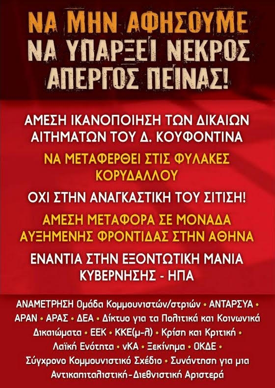 - Άμεση ικανοποίηση των δίκαιων αιτημάτων του απεργού πείνας Δ. Κουφοντίνα