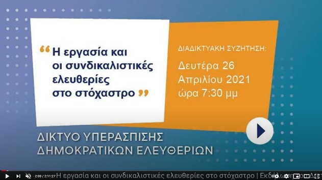 Το Δίκτυο για την Υπεράσπιση των Δημοκρατικών Ελευθεριών διοργάνωσε διαδικτυακή συζήτηση με θέμα «Η εργασία και συνδικαλιστικές ελευθερίες στο στόχαστρο», την Δευτέρα 26 Απριλίου 2021, στις 7.30 μ.μ.