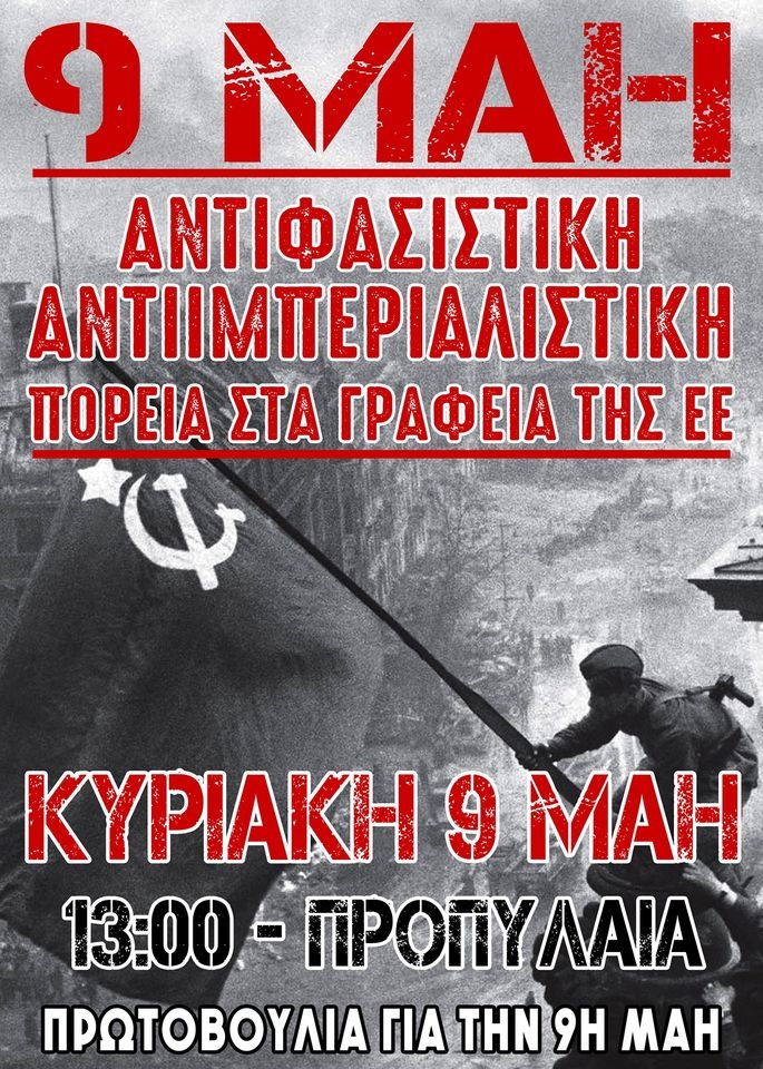 Ο Πανελλαδικός Αντιπολεμικός Κινηματικός Συντονισμός (Π.Α.Κ.Σ.) συμμετέχει στην αντιφασιστική-αντιιμπεριαλιστική διαδήλωση της 9ης Μάη, τιμώντας τα 76 χρόνια από την ημέρα που ο αντιφασιστικός αγώνας των λαών οδήγησε στην συντριβή του ναζισμού, με τελική πράξη την νίκη του Κόκκινου Στρατού στο Βερολίνο και το γκρέμισμα του ναζιστικού συμβόλου από το Ράιχσταγκ, όπου στην θέση του μπήκε η κόκκινη σημαία.