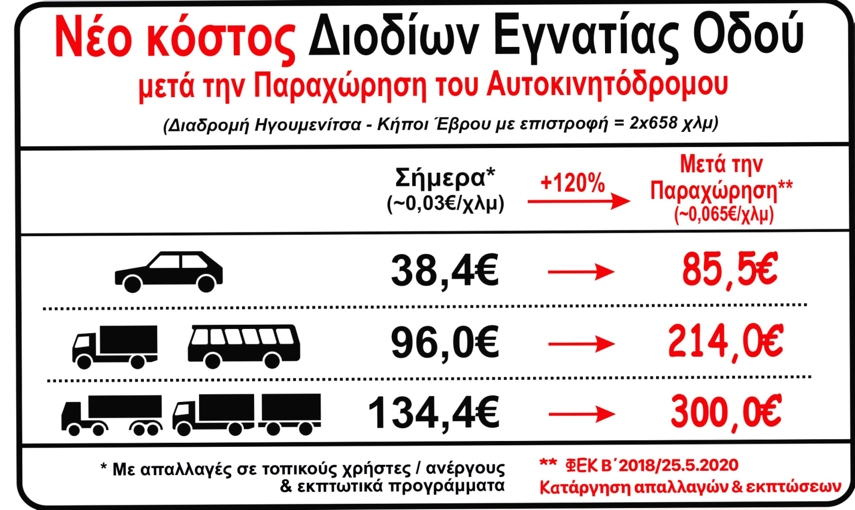 3 Η τεράστια αύξηση στα προβλεπόμενα έσοδα (11,35δισ.€) από τη διαχείριση της Εγνατίας Οδού, όπως προκύπτει από το χρηματοοικονομικό μοντέλο του παραχωρησιούχου που ανακοινώθηκε από το ΤΑΙΠΕΔ, οφείλεται αποκλειστικά στην υπέρογκη αύξηση του κόστους διοδίων που θα πληρώνουν οι χρήστες της Εγνατίας Οδού. Η οικονομική επιβάρυνση θα είναι άμεση για τους χρήστες της οδού και αποτυπώνεται στον πίνακα: