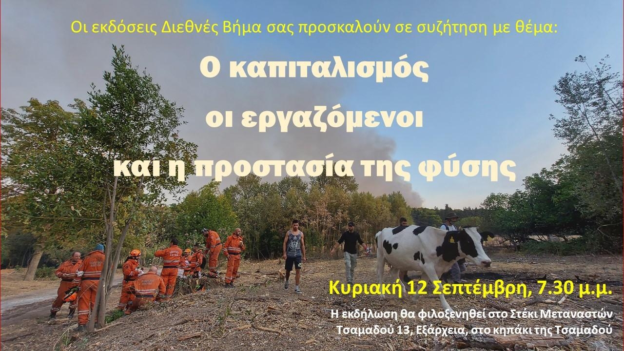 Το 2021 πυρκαγιές καταστρέφουν τεράστιες δασικές εκτάσεις σε Αλγερία, Ελλάδα, Τουρκία, Καναδά, Μεξικό, Σιβηρία, Καλιφόρνια και αλλού. Ταυτόχρονα η Γερμανία έχει πληγεί από πλημμύρες, η Καραϊβική από καταστροφικούς τυφώνες, ενώ άλλα μέρη του κόσμου πάσχουν από ξηρασία. Η ζημιά στο περιβάλλον είναι μεγάλη, αλλά και οι κοινωνικές συνέπειες είναι τεράστιες καθώς καταστρέφονται οι ζωές εκατομμυρίων ανθρώπων. Το ερωτήματα που τίθεται είναι: Πρόκειται για φυσικές καταστροφές, ή για τα αποτελέσματα της λειτουργίας του οικονομικού συστήματος του καπιταλισμού και των αξιών του; Είναι ταξικά ουδέτερες, επηρεάζοντας όλες τις τάξεις με τον ίδιο τρόπο; Πώς θα μπορέσει να σωθεί τόσο το φυσικό περιβάλλον όσο και ο κόσμος της εργασίας, οι δύο πηγές του κέρδους στον καπιταλισμό, τι στιγμή που εντείνεται ο ανταγωνισμός, βαθαίνει η κρίση και αυξάνεται η εκμετάλλευση – και της γης και της εργασίας;