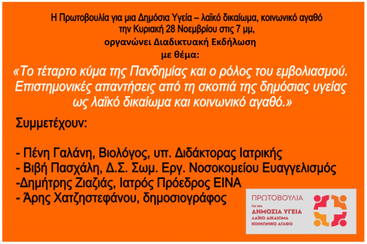 Εκδήλωση της Πρωτοβουλίας για μια δημόσια υγεία με θέμα: «Το τέταρτο κύμα της Πανδημίας και ο ρόλος του εμβολιασμού».link