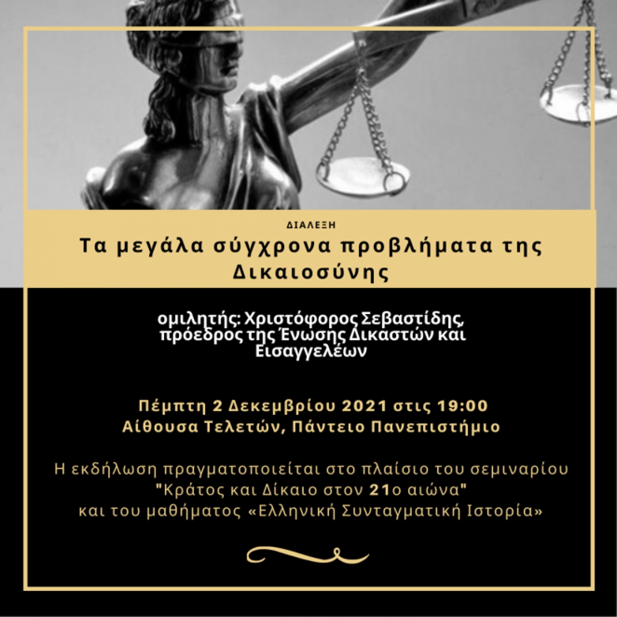 Η εκδήλωση πραγματοποιείται στο πλαίσιο του σεμιναρίου «Κράτος και δίκαιο στον 21ο αιώνα» και του μαθήματος «Ελληνική Συνταγματική Ιστορία».