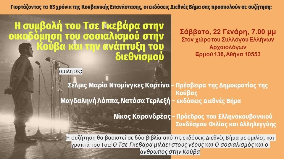 Γιορτάζοντας τα 63 χρόνια της Κουβανικής Επανάστασης, οι εκδόσεις Διεθνές Βήμα σας προσκαλούν σε συζήτηση με θέμα «Η συμβολή του Τσε Γκεβάρα στην οικοδόμηση του σοσιαλισμού στην Κούβα και την ανάπτυξη του διεθνισμού».