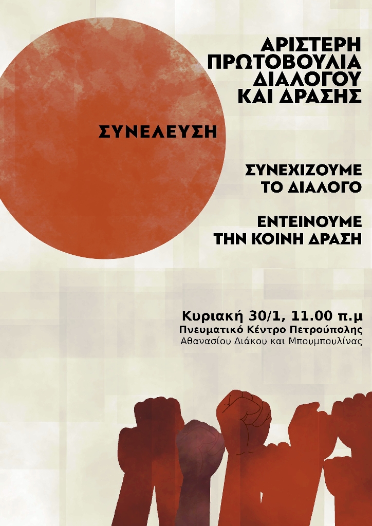 Για αυτούς τους λόγους, δημιουργήθηκε η Αριστερή Πρωτοβουλία Διαλόγου και Δράσης, με την ισότιμη συμμετοχή ανένταχτων αγωνιστών, αγωνιστριών και οργανωμένων δυνάμεων της ασυμβίβαστης, ριζοσπαστικής και ανατρεπτικής Αριστεράς, δίνοντας τον πρώτο λόγο στους εργαζόμενους, στις γυναίκες και τη μαχόμενη διανόηση. Πάνω από όλα, στη νέα γενιά.
