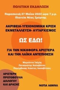 ΑΝΑΚΟΙΝΩΣΕΙΣ - ΕΚΔΗΛΩΣΕΙΣ Εκδήλωση Αριστερής Πρωτοβουλίας στη Νέα Σμύρνη, Παρασκευή 27/5 Από KOMMON - 27 Μαΐου, 2022 0 104 FacebookX Μιλούν: Μαριάννα Τσίχλη και Παναγιώτης Καλαβάνος Παρέμβαση: Κώστας Λαπαβίτσας