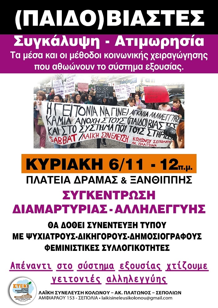 Η «Λαϊκή Συνέλευση Κολωνού-Ακ. Πλάτωνα- Σεπολίων» συνεχίζει την πολύμορφη δράση της για το τεράστιο θέμα των (παιδο)βιασμών, της έμφυλης κακοποίησης, της φτώχειας και των κυκλωμάτων μαστροπείας. Πάνω στην δυσώδη υπόθεση μαστροπείας στον Κολωνό, το οργανωμένο σύστημα εξουσίας, ενορχηστρώνει περίτεχνα τον ιστό της συγκάλυψης. Βομβαρδίζει με πληροφορίες πολλές αναιρούμενες μεταξύ τους, στρέφει τον κόσμο στην “τερατολογία” και την “κλειδαρότρυπα, διασύροντας την οικογένεια. Με τη μέθοδο αυτή και με τη συμμετοχή πολλών Μέσων ενημέρωσης, καταπατώνται στοιχειώδη δημοκρατικά δικαιώματα στην προδικασία, επιμερίζονται ίσες ευθύνες στο οικογενειακό περιβάλλον ή στη τοπική κοινωνία που λένε ό,τι ήξερε. Αφήνουν εσκεμμένα απ’ έξω το σύστημα εξουσίας που γεννά και τρέφει τέρατα τύπου Μίχου, τις διασυνδέσεις που είχε δημιουργήσει στην περιοχή, το κύκλωμα με πολιτικούς, επιχειρηματικούς, εκκλησιαστικούς παράγοντες, την αστυνομία, τοπικούς δημοτικούς και περιφερειακούς παράγοντες.
