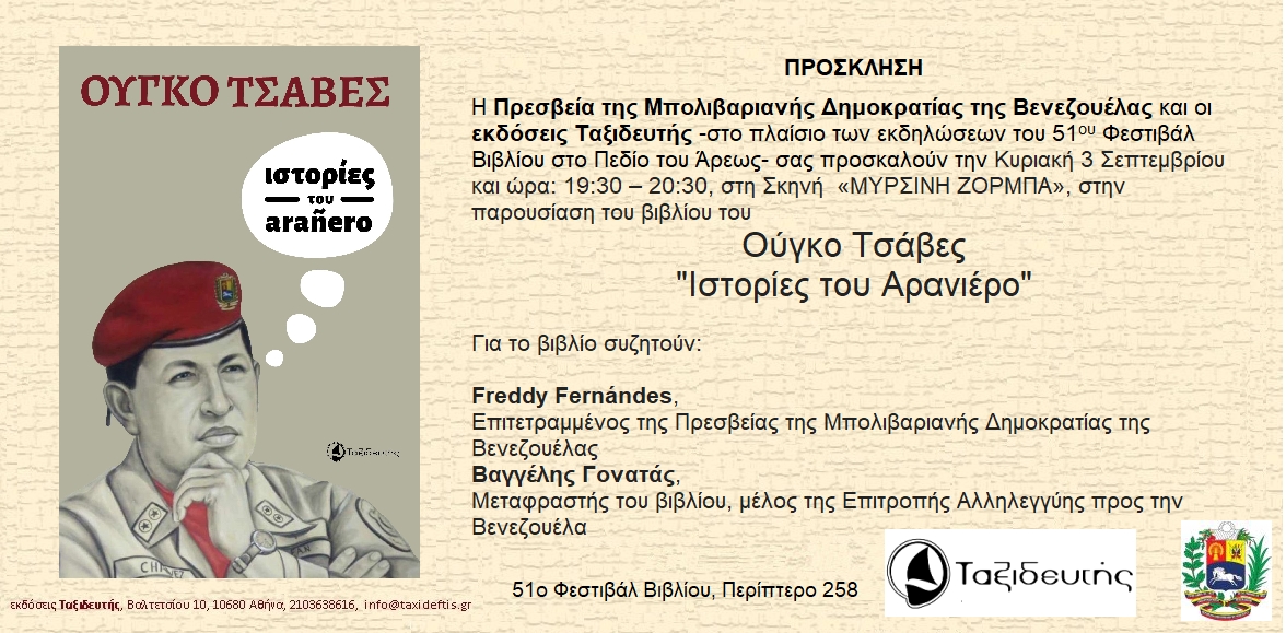 Η πρεσβεία της Μπολιβαριανής Δημοκρατίας της Βενεζουέλας και οι εκδόσεις Ταξιδευτής παρουσιάζουν την Κυριακή 3 Σεπτεμβρίου 2023 και ώρα 19.30 στη σκηνή Μυρσίνη Ζορμπά το βιβλίο του Ούγκο Τσάβες «Ιστορίες του Αρανιέρο».