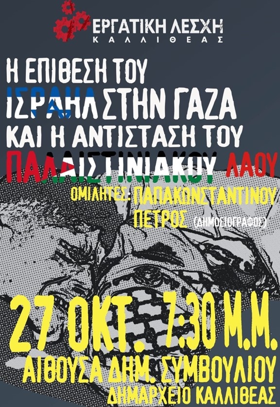 Την Παρασκευή 27 Οκτ. στις 7:30 μ.μ. η Εργατική Λέσχη Καλλιθέας διοργανώνει την εκδήλωση συζήτηση με θέμα: «Η Επίθεση του Ισραήλ στη Γάζα και η Αντίσταση του Παλαιστινιακού Λαού.» Η εκδήλωση θα πραγματοποιηθεί στην αίθουσα του Δημοτικού συμβουλίου στο Δημαρχείο της Καλλιθέας (Μαντζαγριωτάκη 76 – 2ο υπόγειο) και ομιλητής θα είναι ο δημοσιογράφος Πέτρος Παπακωνσταντίνου.