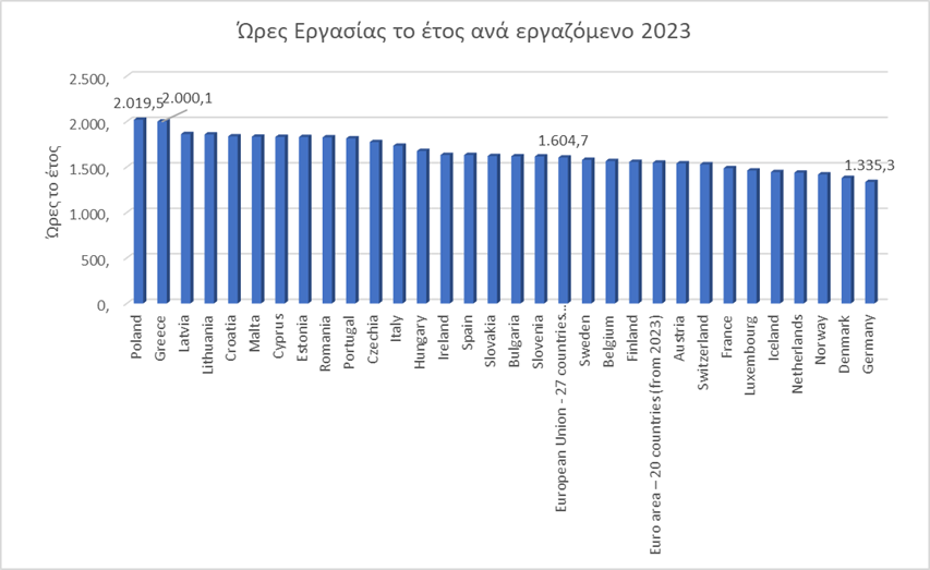Από  την  άποψη  αυτή  είναι  ενδιαφέρον  να  σημειωθεί  ότι  στην  Ελλάδα  από   το  παραγόμενο  προϊόν ανά  εργαζόμενο  μόλις  το  33%  αποτελεί  την  αμοιβή των  εργαζομένων  όταν  ο  μέσος  όρος  των  χωρών  της  Ευρώπης (Ε.Ε.-27)  είναι  41%. Στην  Βουλγαρία  οι  εργαζόμενοι  αμείβονται  με το  35%  του  παραγόμενου  προϊόντος  ανά  εργαζόμενο, τη  στιγμή  μάλιστα  που  οι  Έλληνες  εργάζονται  τις  πιο  πολλές  ώρες (2.000  ώρες)  ετησίως  ανά  εργαζόμενο, πίσω μόνο από την Πολωνία με  2.019  ώρες  ανά  εργαζόμενο  το  έτος, με τον  μέσο  όρο  των  χωρών  της  Ευρώπης  να  είναι  στις  1.604  ώρες  ετησίως  και  στην Βουλγαρία  ο  κάθε  εργαζόμενος  εργάζεται  1.617  ώρες  το  έτος (Δάγραμμα).