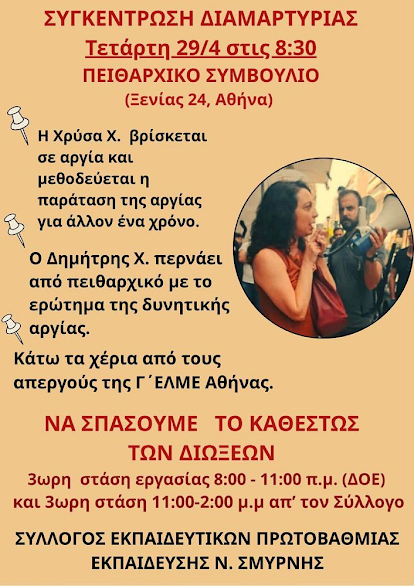 Την ΤΕΤΑΡΤΗ 29/4 ΟΛΟΙ/ΕΣ 8:30 ΣΤΟ ΠΡΩΤΟΒΑΘΜΙΟ ΠΕΙΘΑΡΧΙΚΟ ΣΥΜΒΟΥΛΙΟ (Ξενίας 24, Αθήνα κοντά στο μετρό Μέγαρο Μουσικής) όπου εκδικάζονται  με το ερώτημα της αργίας ο νεαρός εκπαιδευτικός Δημήτρης Χαρτζουλάκης μέλος της Α΄ ΕΛΜΕ Δυτικής Αττικής και τη συνέχιση της αργίας για την Χρύσα Χοτζόγλου, μέλος της ΕΛΜΕ Πειραιά,  για τη συμμετοχή τους σε κινητοποίηση κατά της αξιολόγησης το 2024. Η υπόθεση τους εντάσσεται σε ένα ευρύτερο κύμα διώξεων στην εκπαίδευση, προκαλώντας αντιδράσεις και κινητοποιήσεις.