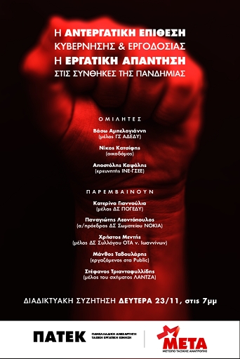 Σε αυτό το πλαίσιο και ενόψει της προώθησης του νέου αντεργατικού νομοσχεδίου Βρούτση, η συνδικαλιστική παράταξη Μέτωπο Ταξικής Ανατροπής (ΜΕΤΑ) και  ηΠανελλαδική Ανεξάρτητη Ταξική Εργατική Κίνηση (ΠΑΤΕΚ) παίρνουμε την πρωτοβουλία και συνδιοργανώνουμε τη διαδικτυακή εκδήλωση – συζήτηση, με θέμα: «Η αντεργατική επίθεση κυβέρνησης και εργοδοσίας – Η εργατική απάντηση στις συνθήκες της πανδημίας», τη Δευτέρα 23 Νοέμβρη και ώρα 7μμ.