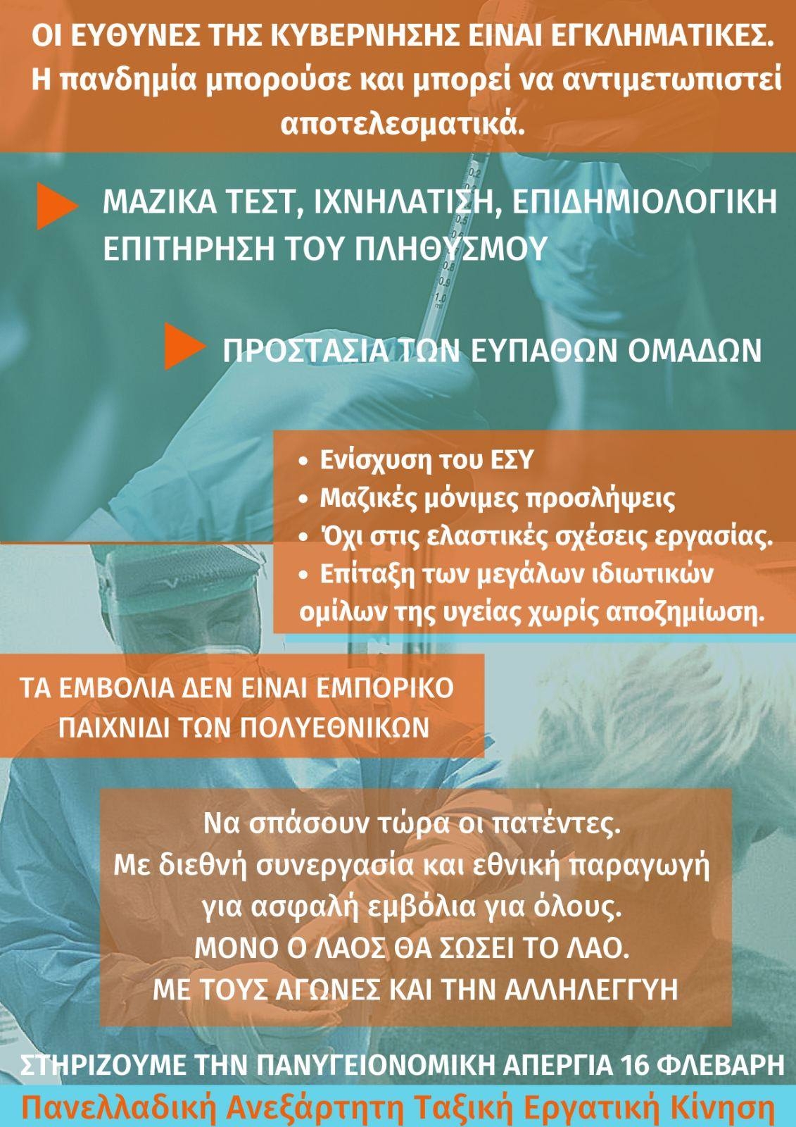 Συνάδελφε Συναδέλφισσα κλείνουμε περίπου ένα χρόνο από την εμφάνιση της πανδημίας του κορωνοϊού στη χώρα μας και ακόμα η νόσος καλπάζει. Βρισκόμαστε μέσα στη δίνη του τρίτου και πιο επικίνδυνου κύματος. Η κυβερνητική διαχείριση έχει επιβεβαιωθεί από την ίδια τη ζωή ως αναποτελεσματική, κοινωνικά ανεύθυνη και εγκληματική. Κανένα ουσιαστικό μέτρο δεν έχει ληφθεί για την πραγματική ενίσχυση του συστήματος υγείας και κυρίως της πρωτοβάθμιας περίθαλψης για να γίνεται έγκαιρη ιχνηλάτηση, διαστρωμάτωση των ευπαθών ομάδων, και έγκαιρη θεραπεία. Κανένα ουσιαστικό μέτρο δεν έχει ληφθεί για την πρόληψη της διασποράς στα σχολεία, στα ΜΜΜ και στους χώρους εργασίας, εκεί δηλαδή που ενέχονται οι μεγαλύτεροι κίνδυνοι ακριβώς γιατί συγχρωτίζονται δεκάδες, εκατοντάδες άνθρωποι σε κλειστούς χώρους για μεγάλο χρονικό διάστημα.