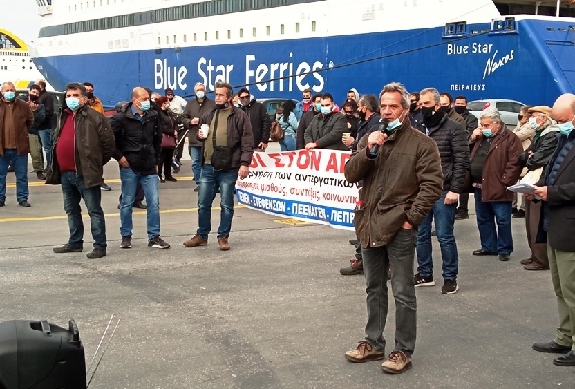Πληρώματα από πλοία που βρίσκονται στον Πειραιά ανταποκρίθηκαν στο κάλεσμα των Σωματείων και συμμετείχαν στην συγκέντρωση έξω από το BLUE STAR DELOS.