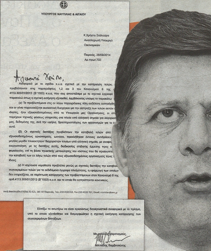 Σύμφωνα με τα έγγραφα επικοινωνίας (9/2014) μεταξύ των δύο Υπουργών προκύπτει ότι ο κ. Βαρβιτσιώτης ζητούσε μετ’ επιτάσεως να καταργηθεί σχετική ΚΥΑ η οποία όριζε “για την επιθεώρηση προς έκδοση ή ανανέωση ή θεώρηση πιστοποιητικού Ναυτικής Εργασίας οι νηογνώμονες θα έπρεπε να καταβάλουν ανάλογα τέλη. Στην περίπτωση που η Ναυτιλιακή εταιρεία επέλεγε να λάβει το πιστοποιητικό από την αρμόδια αρχή (ΔΕΠ) θα έπρεπε να καταβάλει 300 ευρώ για πλοία μέχρι 1000 κοχ ενώ για πλοία 1.000 έως 10.000 ή από 10.000 κοχ και άνω θα έπρεπε να πληρώσει 500 και 800 ευρώ αντίστοιχα.”