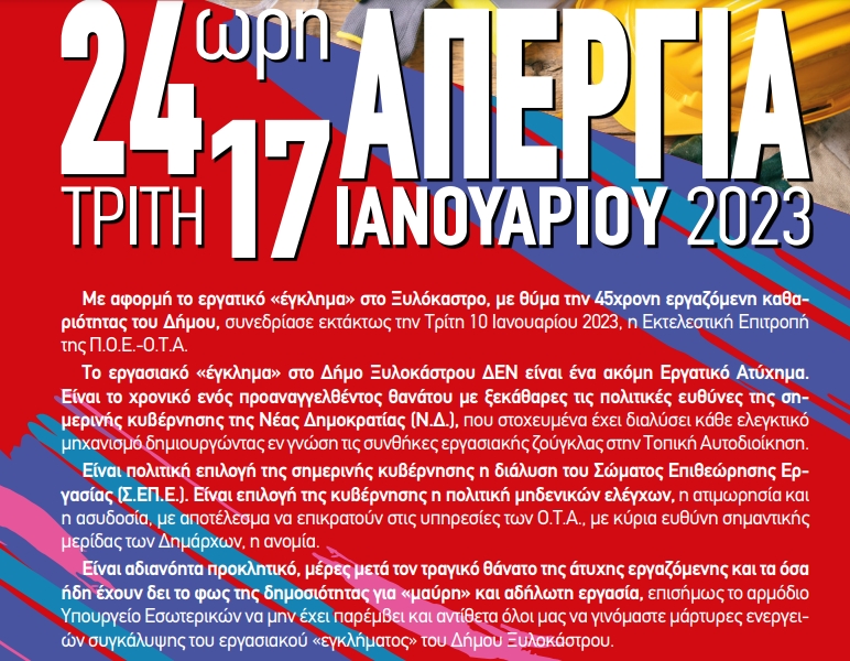 Η χθεσινή τραγωδία στο Ξυλόκαστρο, συνέβη λίγες μόνο ημέρες μετά το τροχαίο ατύχημα σοκ επί της Λεωφόρου Σουνίου, παραμονή Χριστουγέννων με θύμα και βαρύτατα τραυματισμένο έναν επίσης Δημοτικό Υπάλληλο καθαριότητας. Το 2022 έκλεισε με ένα τραγικό ατύχημα και το 2023 μπήκε με τον χειρότερο τρόπο. Ένας Δημοτικός Υπάλληλος έδινε μάχη να κρατηθεί στη ζωή και για μια γυναίκα κόπηκε πρόωρα το νήμα της ζωής, αντίστοιχα. Και οι δύο αγωνίζονταν για ένα μεροκάματο. Την ίδια στιγμή τόσο η αδικοχαμένη εργαζόμενη καθαριότητας όσο και το υπόλοιπο πλήρωμα του απορριμματοφόρου φέρεται να είναι ανασφάλιστο, δίχως εργασιακή σχέση με τον Δήμο. Και εάν αυτό επιβεβαιωθεί θα μιλάμε για «έγκλημα»