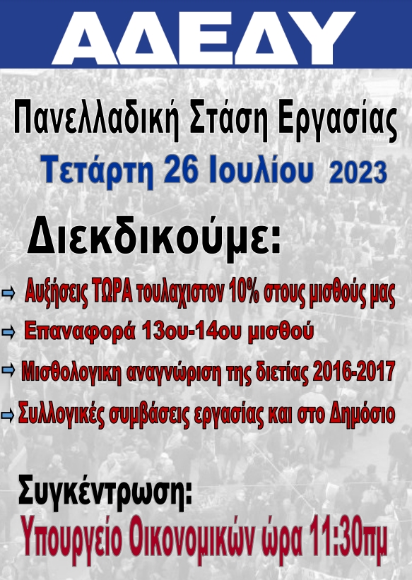 Η Εκτελεστική Επιτροπή της Α.Δ.Ε.Δ.Υ. με αφορμή την κατάθεση του νομοσχεδίου «Ενίσχυση του εισοδήματος των μισθωτών, των νέων, της οικογένειας και της εργασίας – συνταξιοδοτικές ρυθμίσεις» και την ψήφισή του την επόμενη βδομάδα από τη Βουλή, αποφάσισε την κήρυξη πανελλαδικής στάσης εργασίας την Τετάρτη 26 Ιουλίου 2023 (μέρα ψήφισης του νομοσχεδίου) από τις 11.00πμ μέχρι τη λήξη του ωραρίου και την πραγματοποίηση συγκέντρωσης διαμαρτυρίας την ίδια μέρα στις 11.30πμ στο Υπουργείο Οικονομικών (Νίκης 5-7). Καλούμε τα  Νομαρχιακά Τμήματα της Α.Δ.Ε.Δ.Υ. να οργανώσουν αντίστοιχες συγκεντρώσεις σε όλη τη χώρα.